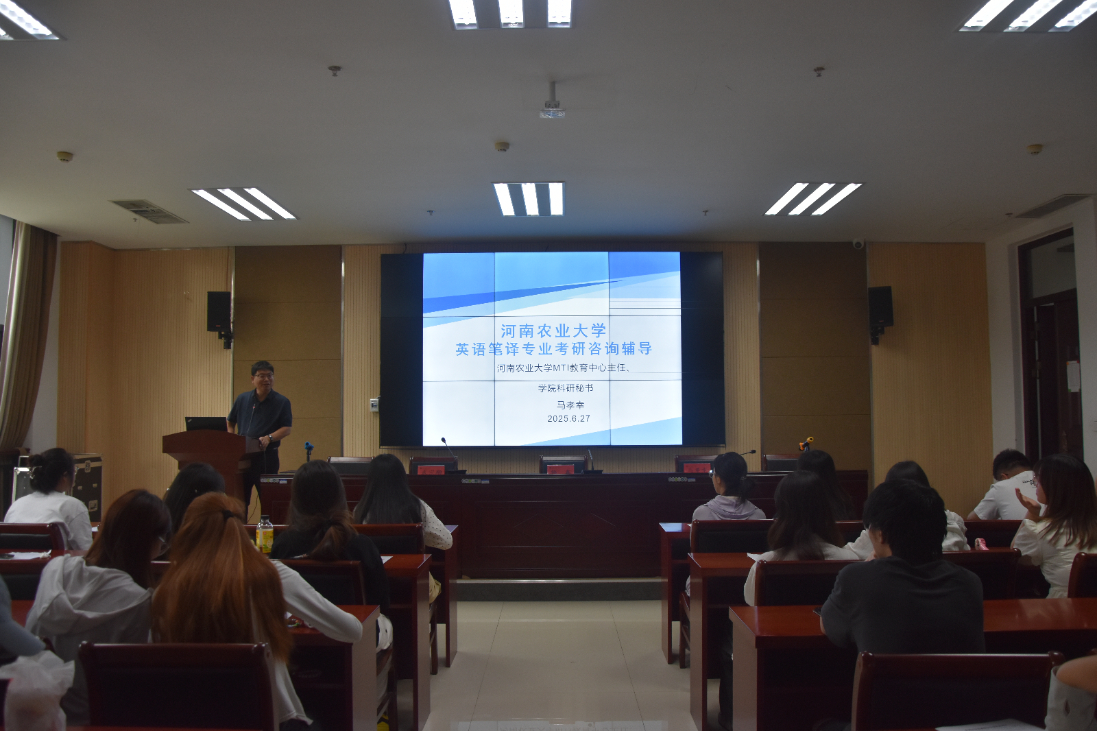 本网讯(审稿:杨鑫 供稿:武宗励 张梦晗)为进一步为学生提供全面的考研政策解读和备考指导,做好研究生招生宣传工作。6月27日,大奶做爱 繁塔楼A324开展考研指导暨研究生招考信息宣讲会。宣讲会由院科研秘书、MTI教育中心主任马孝幸主讲,22级全体留校学生参加会议。