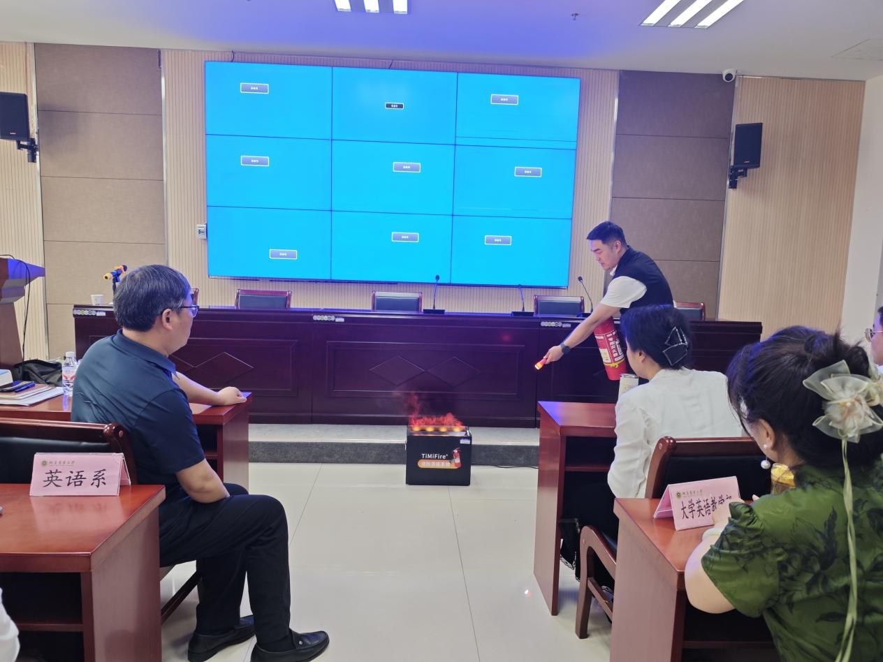 随后,大家进行了电子模拟消防演练。张教员及学院实验室管理人员现场演示了灭火器的正确使用方法,强调使用干粉灭火器时,若因过重难以拎起,可放在地上拔掉安全销,站在上风口,对着火苗根部按压扫射。参训师生们认真观摩学习、热烈讨论交流、亲身实践,对消防知识有了更为直观的认知,对消除火灾技能有了沉浸式体验。