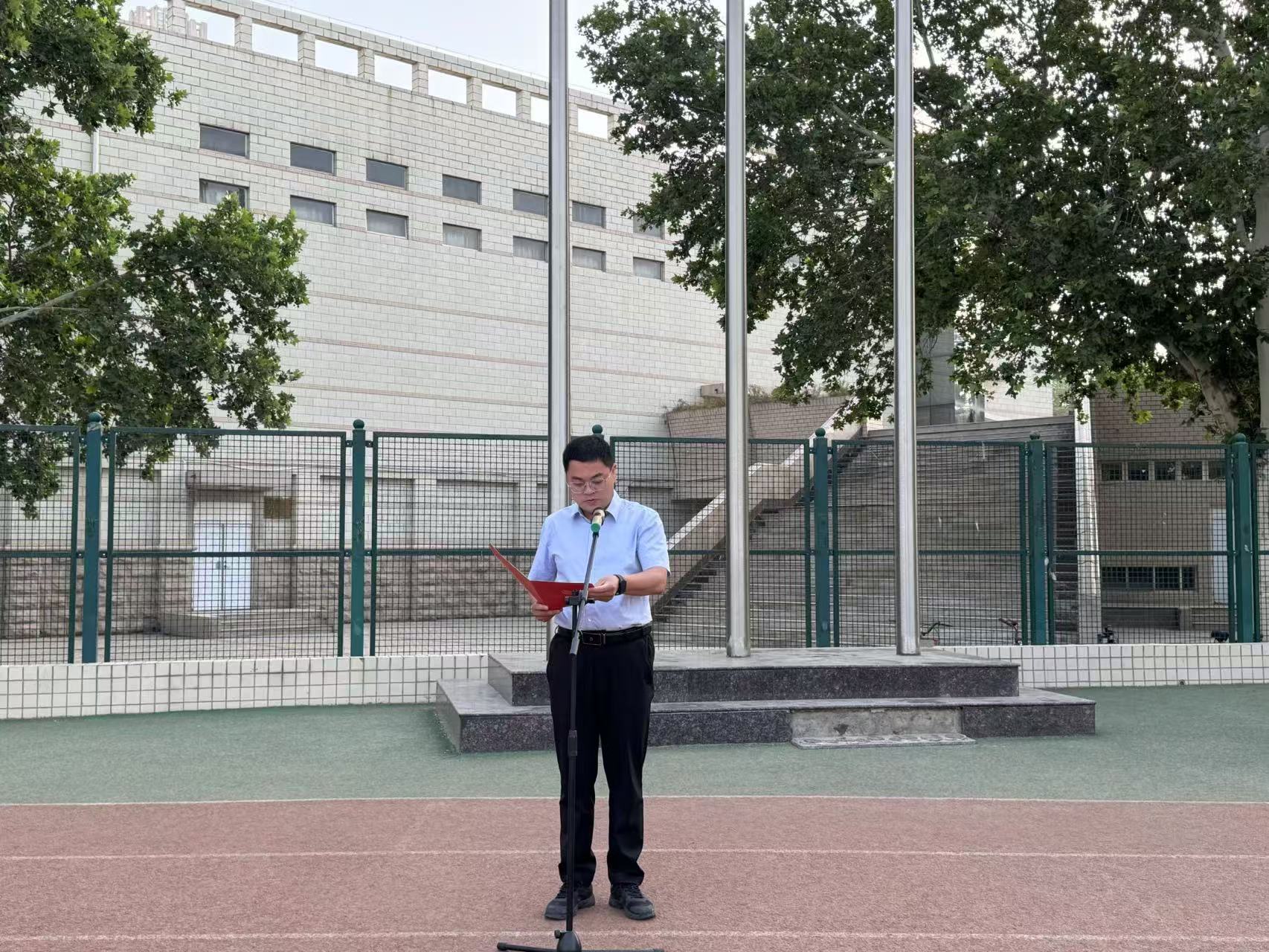 杨鑫发表国旗下的讲话。他向同学们提出三点期望:一、赤子之心,当以语言为桥,厚植家国情怀。二、一流之梦,当以创新为帆,勇攀学术高峰。三、青春之志,当以奋斗为桨,书写时代答卷。新时代外语人要继续坚定信念,以赤子之心守护文化根脉,以一流之梦激扬奋进力量,在建设中国特色世界一流农业大学的征程中贡献外语人的智慧与担当。