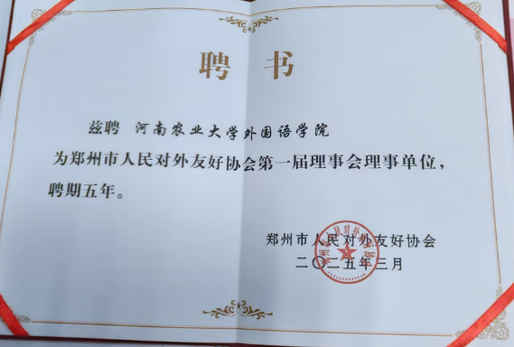 2025年是贯彻全国教育大会精神、落实教育强国建设规划纲要的关键之年,也是学校全力推进“双一流”创建的攻坚之年。此次我院当选郑州市人民对外友好协会第一届理事会理事单位,这既是对学院服务地方国际化能力的认可,也为师生今后参与郑州国际化社会服务实践提供了平台;更是学校国际化赋能行动的不断探索和创新实践,为学校“双一流”创建提供了有力支撑。
