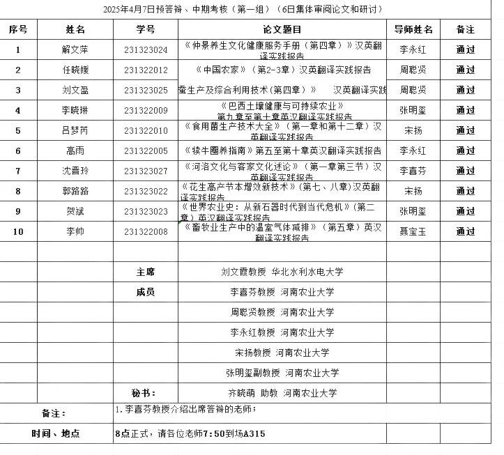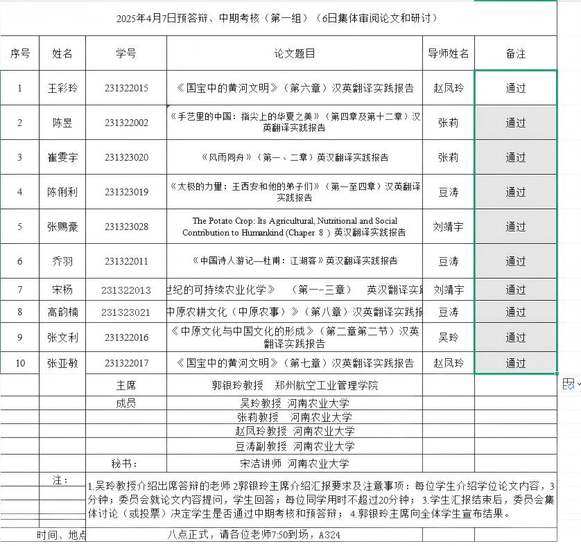 本网讯(审稿:吴玲 ;供稿:马孝幸;摄影:马孝幸 宋洁 齐晓萌 )4月6-7日,我院组织开展了2025年英语笔译专业研究生学位论文预答辩暨中期考核和开题报告论证会。本次论证会特邀华北水利水电大学刘文霞教授、河南财经政法大学孙建华教授和郑州航空工业管理学院郭银玲教授分别担任论证小组主席,我院硕士生导师担任委员,29名研究生参加预答辩暨中期考核,1名研究生参加开题;24级研究生旁听了此次论证会。