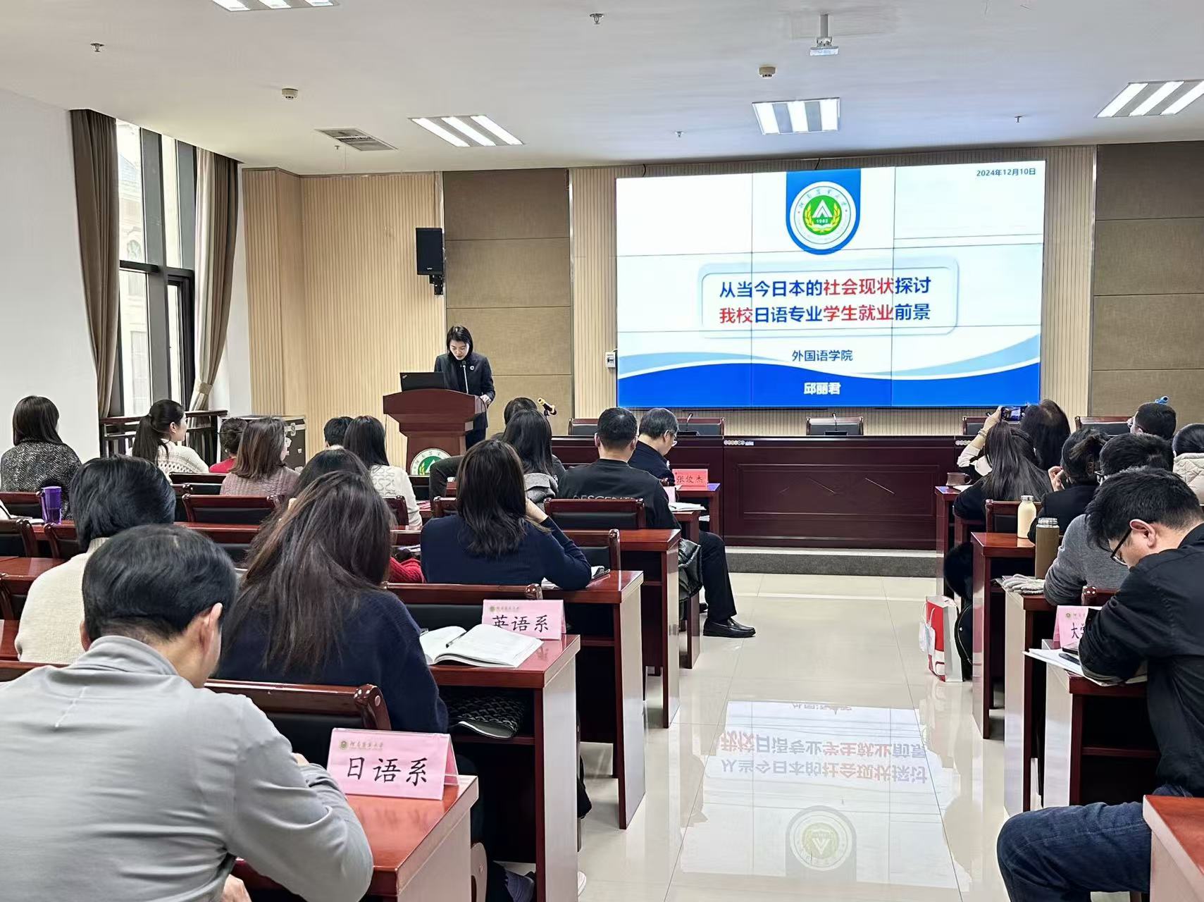 邱丽君以《从当今日本的社会现状探讨我校日语专业学生就业前景》为题,从高科技在日本生活中的应用、日本的超老龄社会、日本在签证政策方面的改革、我校日语专业学生的国际职业发展四个方面分享了在日本访学期间的见闻和感受。她分析了当前我校日语专业学生的就业形势和挑战,并指出日语专业教师将会为学生开拓多元化的就业渠道,帮助学生探索更加广阔的国际职业发展路径。