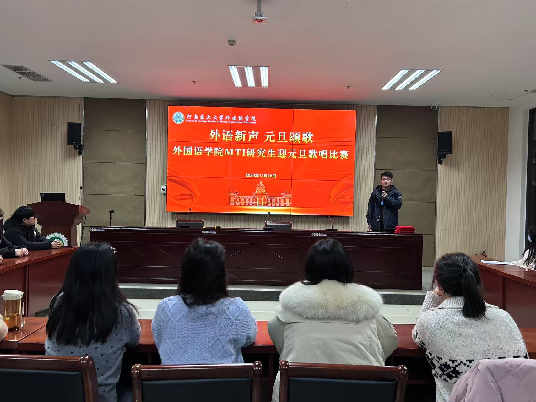 本网讯(审稿:杨鑫 供稿:薛杰)祥龙贺瑞辞旧岁,金蛇欢歌迎新年。值此元旦佳节来临之际,为进一步丰富校园文化生活,营造热烈浓厚的节日氛围,12月26日下午,学院于繁塔楼A324成功举办“外语新声,元旦颂歌”研究生歌唱比赛。研究生辅导员薛杰和学院全体MTI研究生参加本次活动。