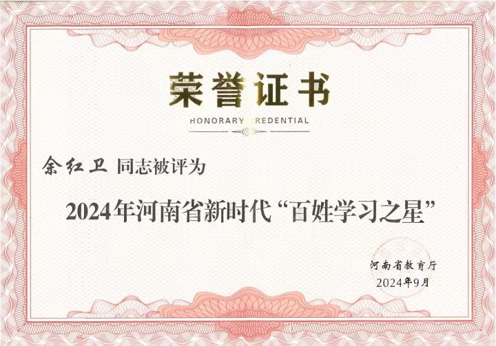 本网讯(通讯员 张德欣)日前,河南省教育厅发布了《河南省教育厅办公室关于公布2024年河南省新时代“百姓学习之星”“终身学习品牌项目”名单的通知》,我院教师余红卫获2024年河南省新时代“百姓学习之星”荣誉称号。