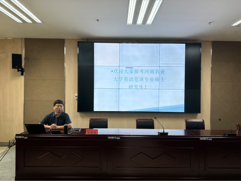 繁塔楼A324开展考研指导暨研究生招考信息宣讲会。宣讲会由院科研秘书、MTI教育中心主任马孝幸主讲,21级全体留校学生参加会议。
