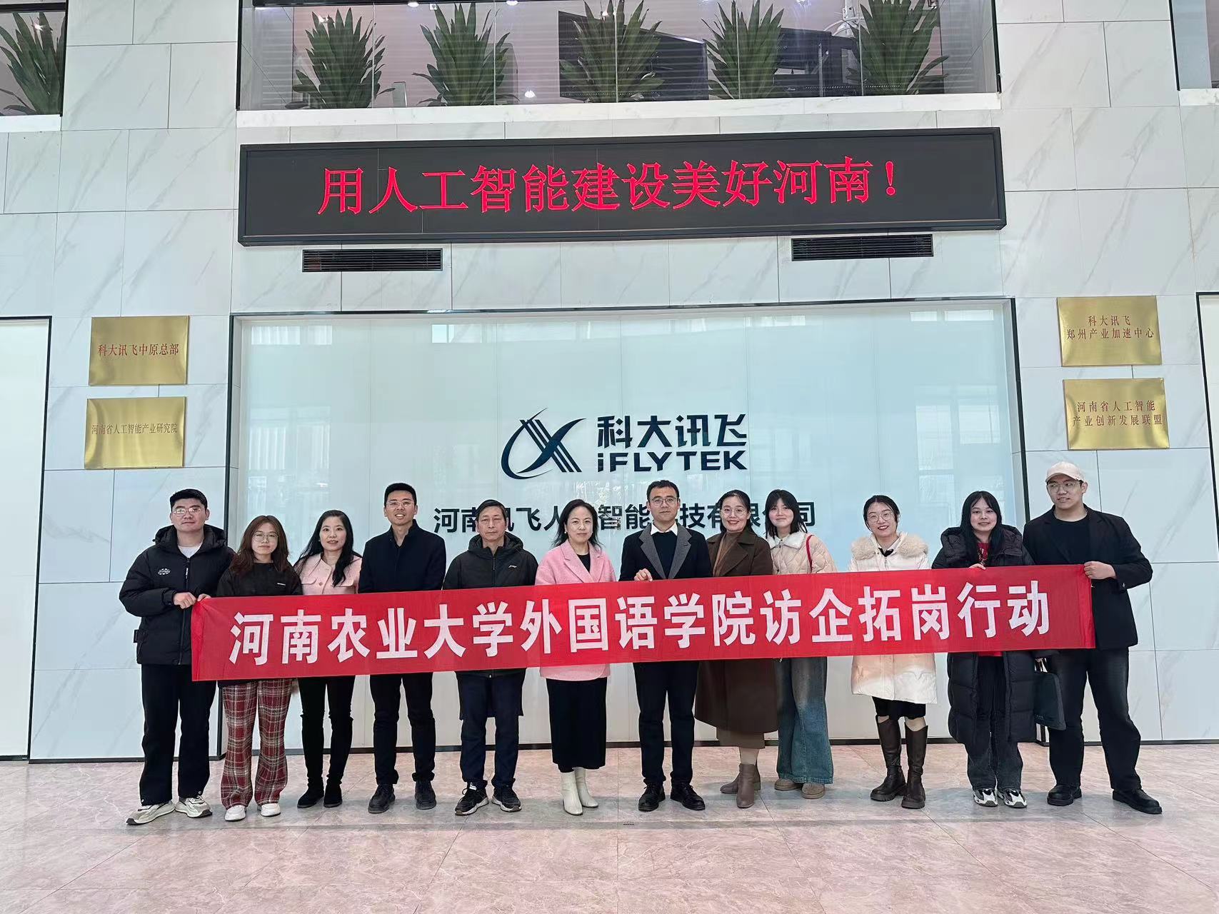 本网讯(审稿:王燕萍 供稿:冯文妍)为加强校企合作,拓宽学生就业渠道,3月8日,大奶做爱 党委书记王燕萍带队赴科大讯飞股份有限公司中原总部开展“访企拓岗”活动,院领导班子成员,英语系、翻译系教师代表,2024届毕业生辅导员和毕业生代表参加活动。