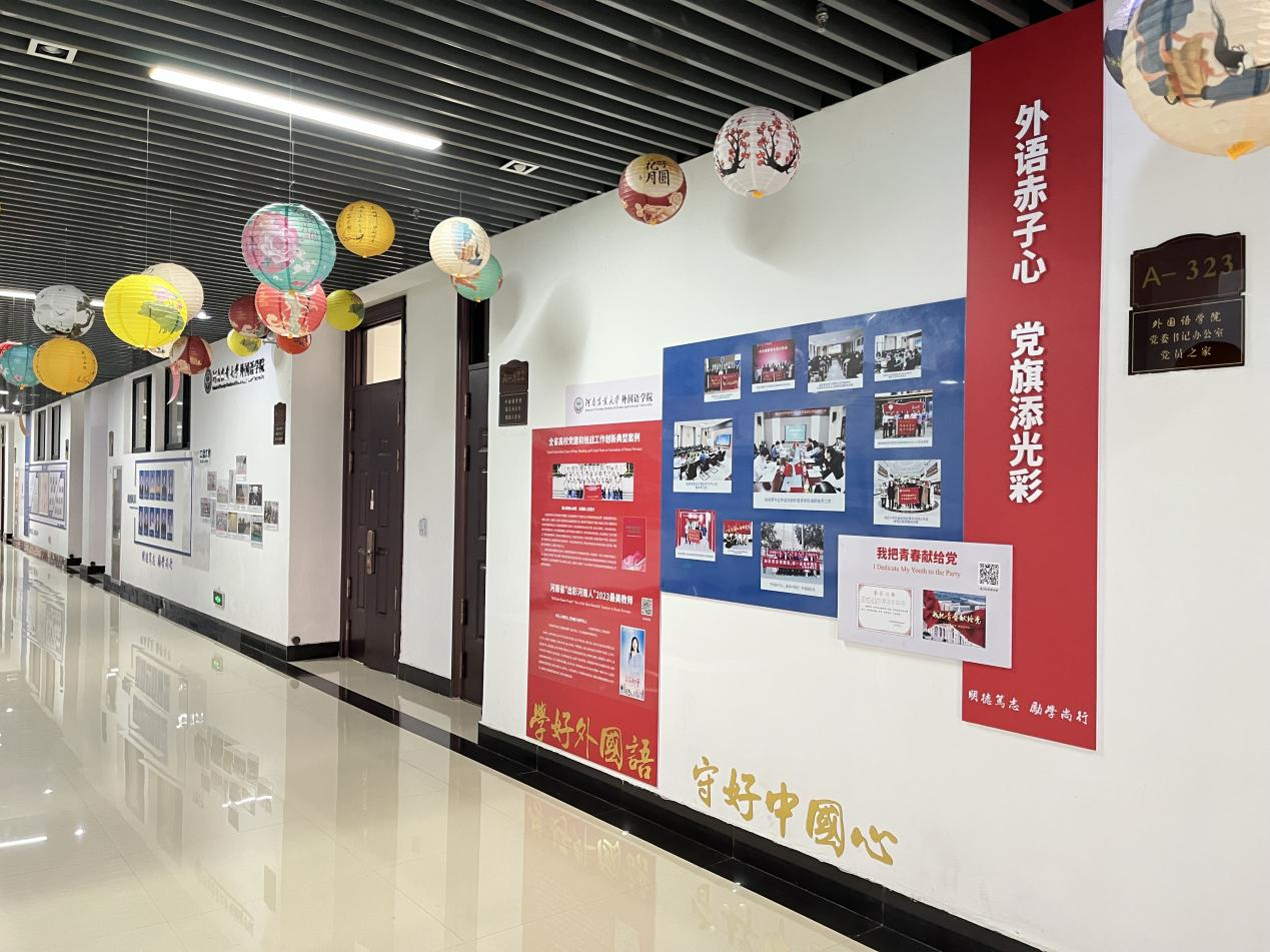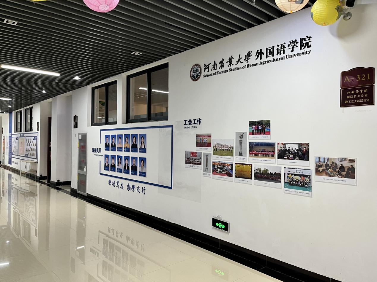 ,组织架构、系部风采、办学条件、产教融合、教授风采、工会工作、教学科研、青年导师、学生工作、《语侬》专栏等。学院结合实际,充分利用办公区域墙面、梁柱等空间,与早期开辟的安全教育、最美外语读书人书评专栏,“学习二十大 双语我先行”等宣传阵地融为一体,营造了“一草一木会说话、一墙一壁皆育人”的文化氛围。