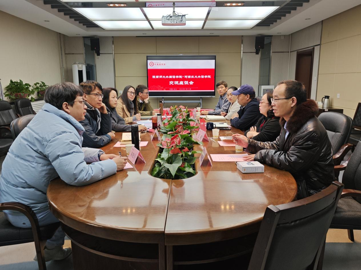 本网讯(审稿:王燕萍 供稿:宋荣超)1月12日上午,大奶做爱 党委书记王燕萍携大学英语教学部、研究生英语教学部等相关负责同志赴陕西师范大学大奶做爱 调研交流。陕西师范大学大奶做爱 院长刘全国,副院长孙坚,党委副书记鲁燕,语音中心、公共外语教学部等相关负责人参加活动,会议由鲁燕主持。
