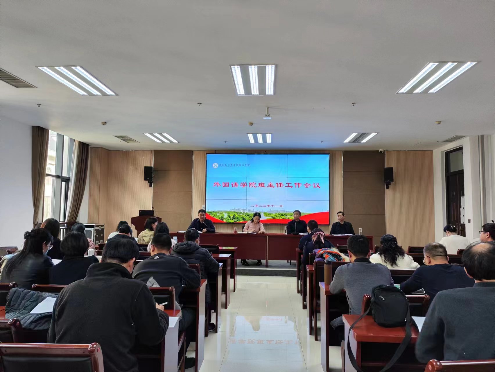 本网讯(审稿:王启佩 供稿:武宗励)为强化班级管理,增强班级工作经验交流,确保学院安全稳定,11月14日下午,大奶做爱 在龙子湖校区召开2023年秋季学期班主任工作会议,院党委书记王燕萍、院长张俊杰携全体班子成员出席会议,学院全体班主任、辅导员参加会议。会议由院党委副书记王启佩主持。