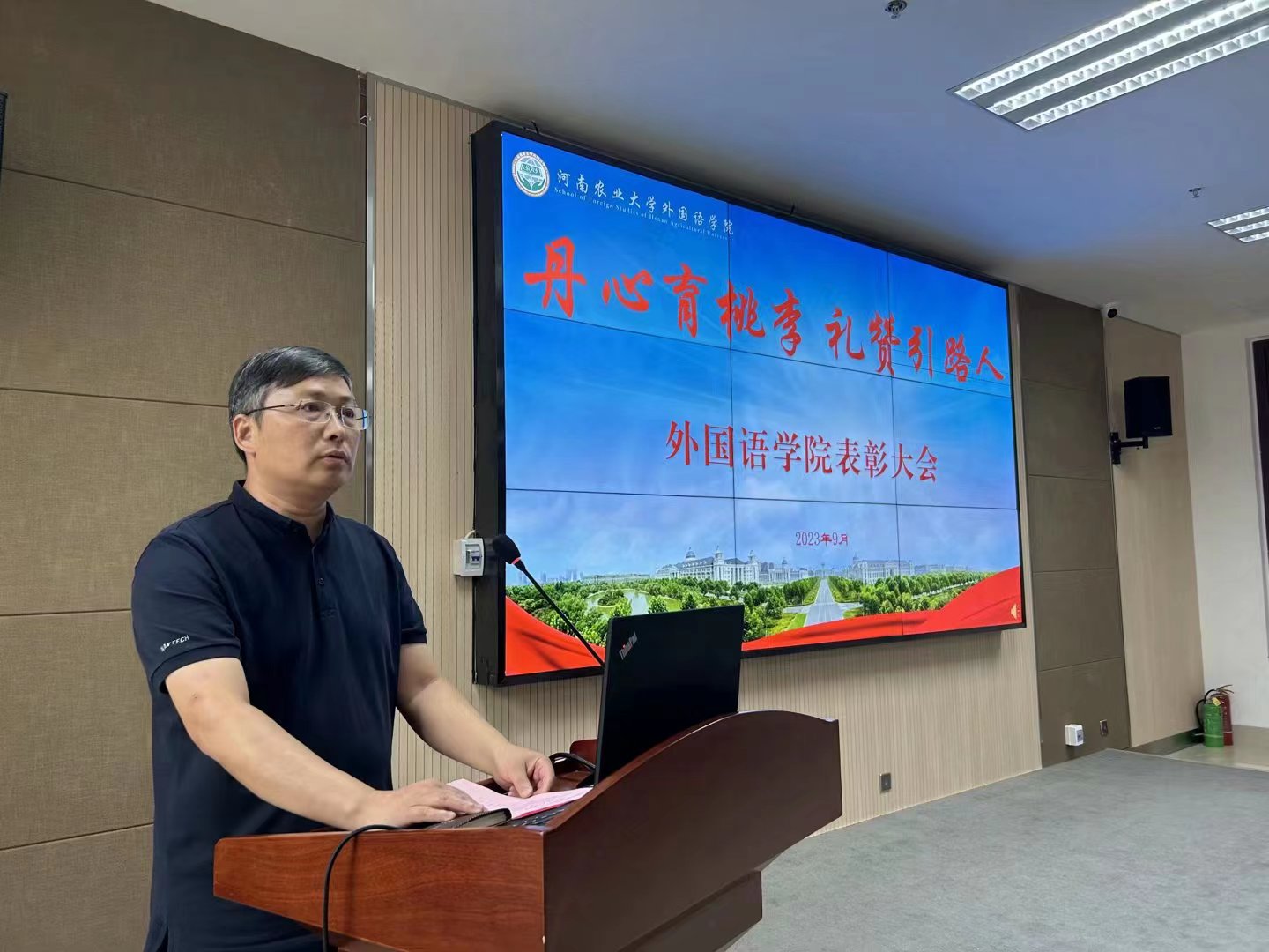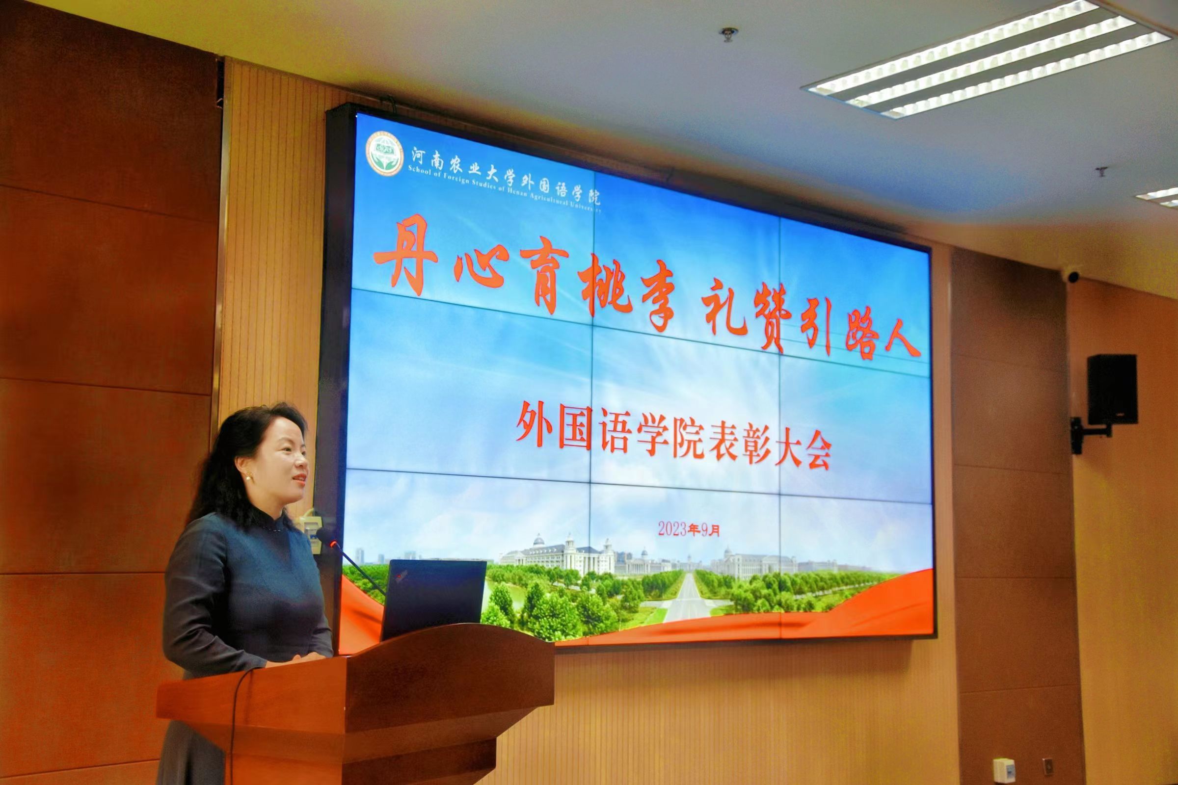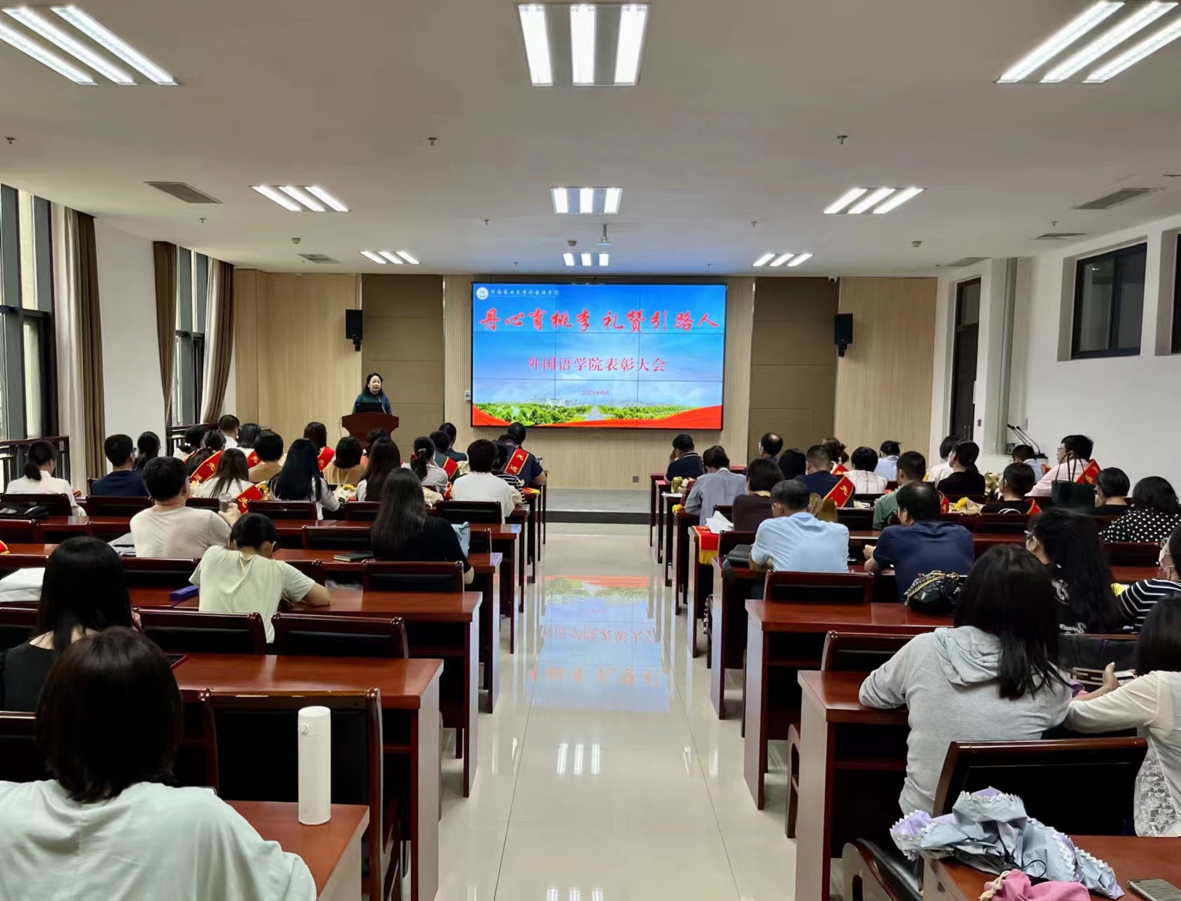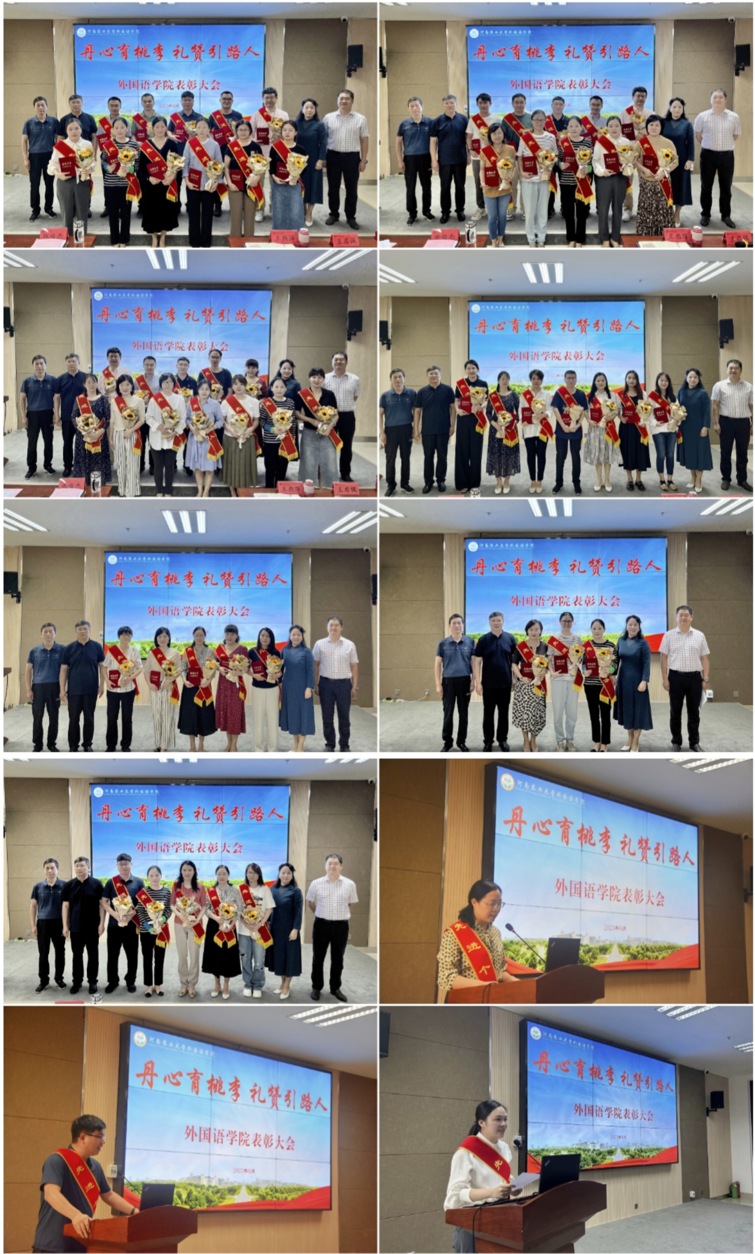 院长张俊杰宣读了获得“出彩河南人”2023年最美教师、河南省文明教师、河南省教学技能大赛一等奖、“翻译河南工程”优秀成果奖,校巾帼标兵、优秀教师、优秀班主任、十佳辅导员等省级、校级荣誉教师名单。副院长张卫东宣读了大奶做爱
