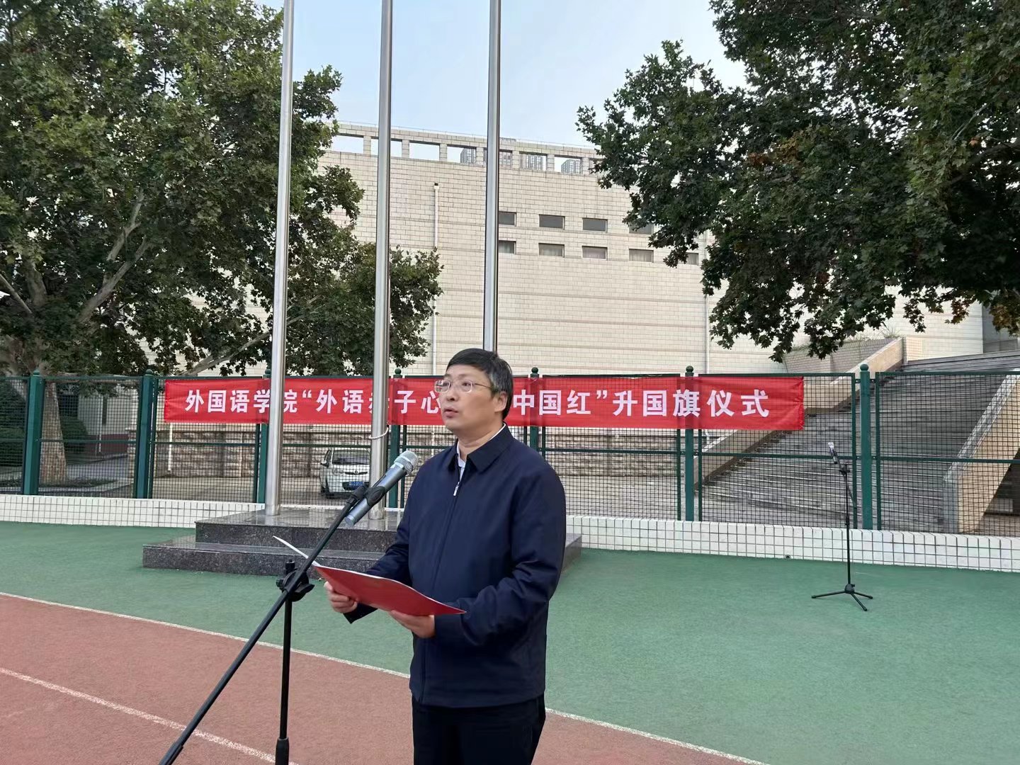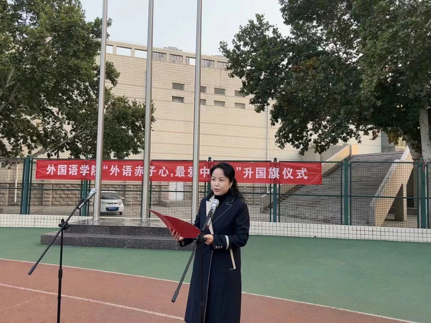 本网讯(审稿:王启佩 供稿:侯彦冰 许菲)10月16日上午,大奶做爱 在文化路校区举行“外语赤子心,最美中国红”升国旗仪式。院党委书记王燕萍、院长张俊杰携院领导班子出席活动,教师代表及2023级全体新生参加本次升旗仪式,升旗仪式由院长张俊杰主持。