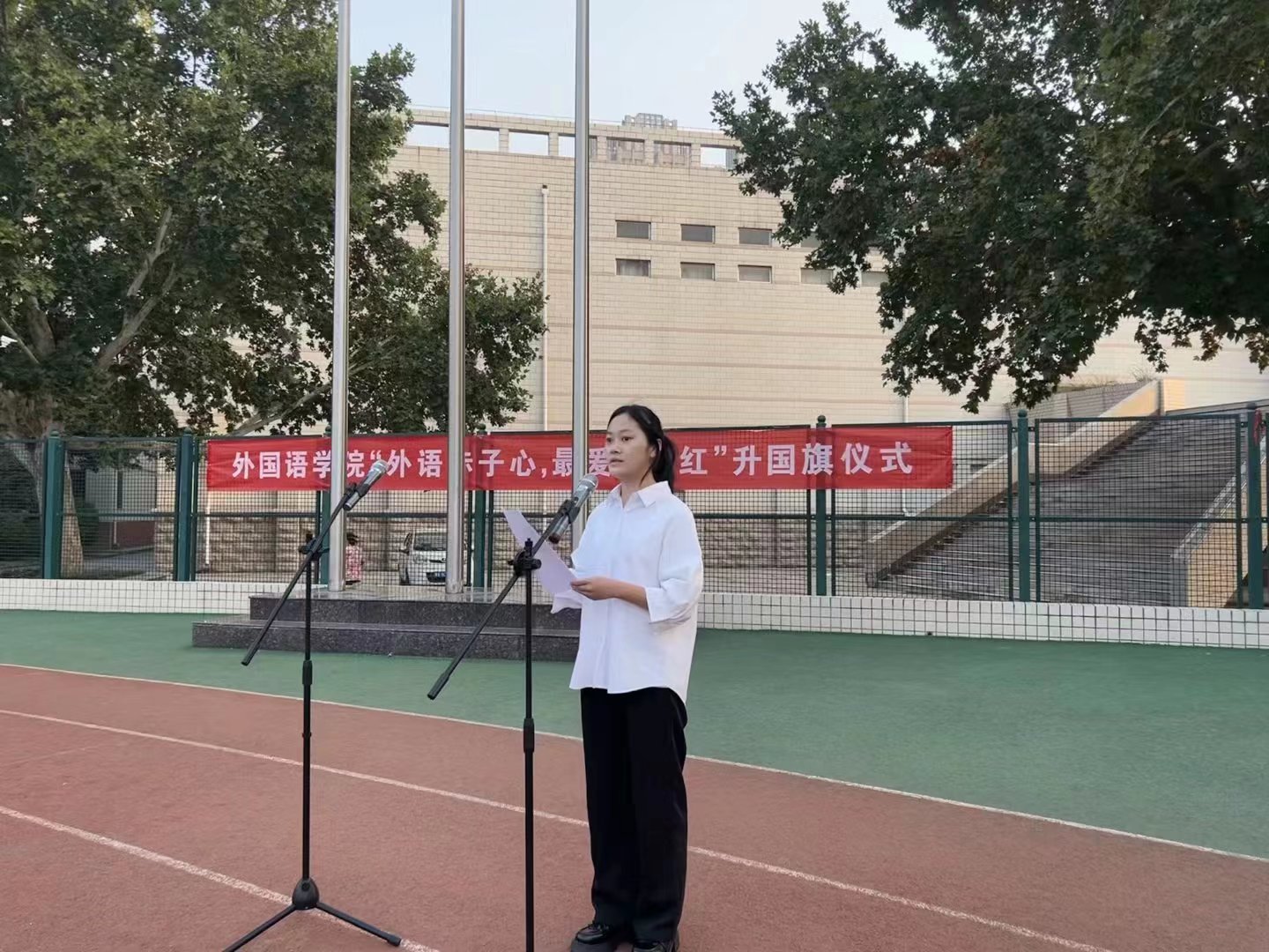 王燕萍发表了国旗下的讲话,她表示,“中国红”是中国革命的颜色、奋斗精神的颜色、人民信仰的颜色、绚丽青春的颜色。在农大121年的办学历程中,广大农大学子以良好的精神风貌和过人的意志品质,做到了“丹心与日月同在,赤诚共红旗飞扬”。她强调,作为新时代的农大外语人,要牢记总书记的嘱托,紧紧围绕“七个着力”,坚定文化自信,坚持守正创新,不断用外语讲好中国故事,传播中国声音,立志做有理想、敢担当、能吃苦、肯奋斗的新时代好青年。