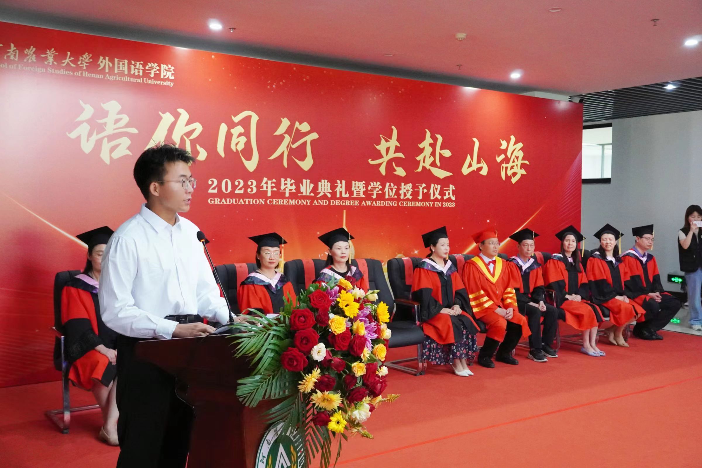 张俊杰总结了学院四年来的发展成绩,回顾了同学们的成长经历,并对2023届全体毕业生提出了殷切希望:一是希望大家长存明辨是非的理性精神,在现实世界里学会为自己的选择负责;二是希望大家永葆热爱祖国的赤子之心。他指出,爱国之行、报国之志是一个人的立身之本、成才之基,也是农大人一脉相承的信念底色,为国家的富强和民族的复兴做出贡献是每个中华儿女义不容辞的责任;三是希望大家胸怀包容开放的思想,为构建人类命运共同体贡献我们外语学者的力量。最后,他寄语毕业生们谨记明德笃志、励学尚行的院训,发扬农大人的质朴、勤奋和实干精神,恪守诚信、坚持学习,在服务社会中建功立业。