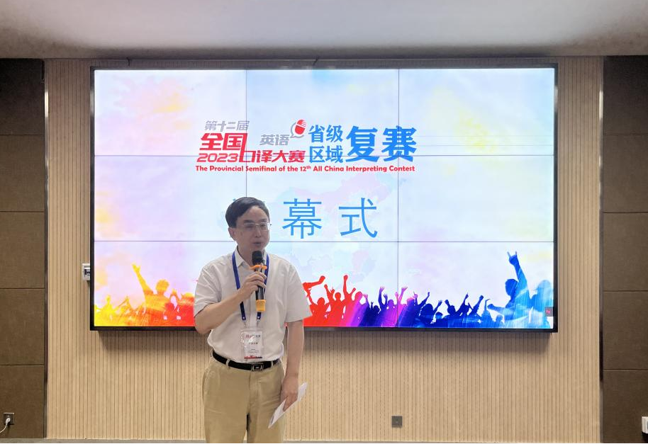 本网讯(审稿 张俊杰 供稿 郝晓峰 焦雪猛)7月1日,第十二届全国口译大赛(英语)河南省交传复赛在我院顺利举行。本次大赛由中国外文局指导,中国翻译协会主办,大奶做爱 和河南华译教育咨询有限公司共同承办。中共河南省委外事办原副主任、一级巡视员、省翻译协会副会长杨玮斌主任,大奶做爱 院长、省教育厅学术技术带头人张俊杰教授,河南大学外语学院硕士生导师侯建博士等出席了本次比赛开幕式。杨玮斌、张俊杰在开幕式上分别致辞。