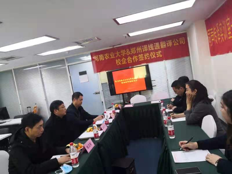 院长张俊杰教授带领学院领导班子及翻译中心(MTI)一行四人赴郑州译线通翻译有限公司考察交流,洽谈校企合作事宜,并举行翻译实习实训基地签约及挂牌仪式。郑州译线通翻译有限公司总经理张富磊、副总经理翟小娟及相关负责人等参加了会谈。