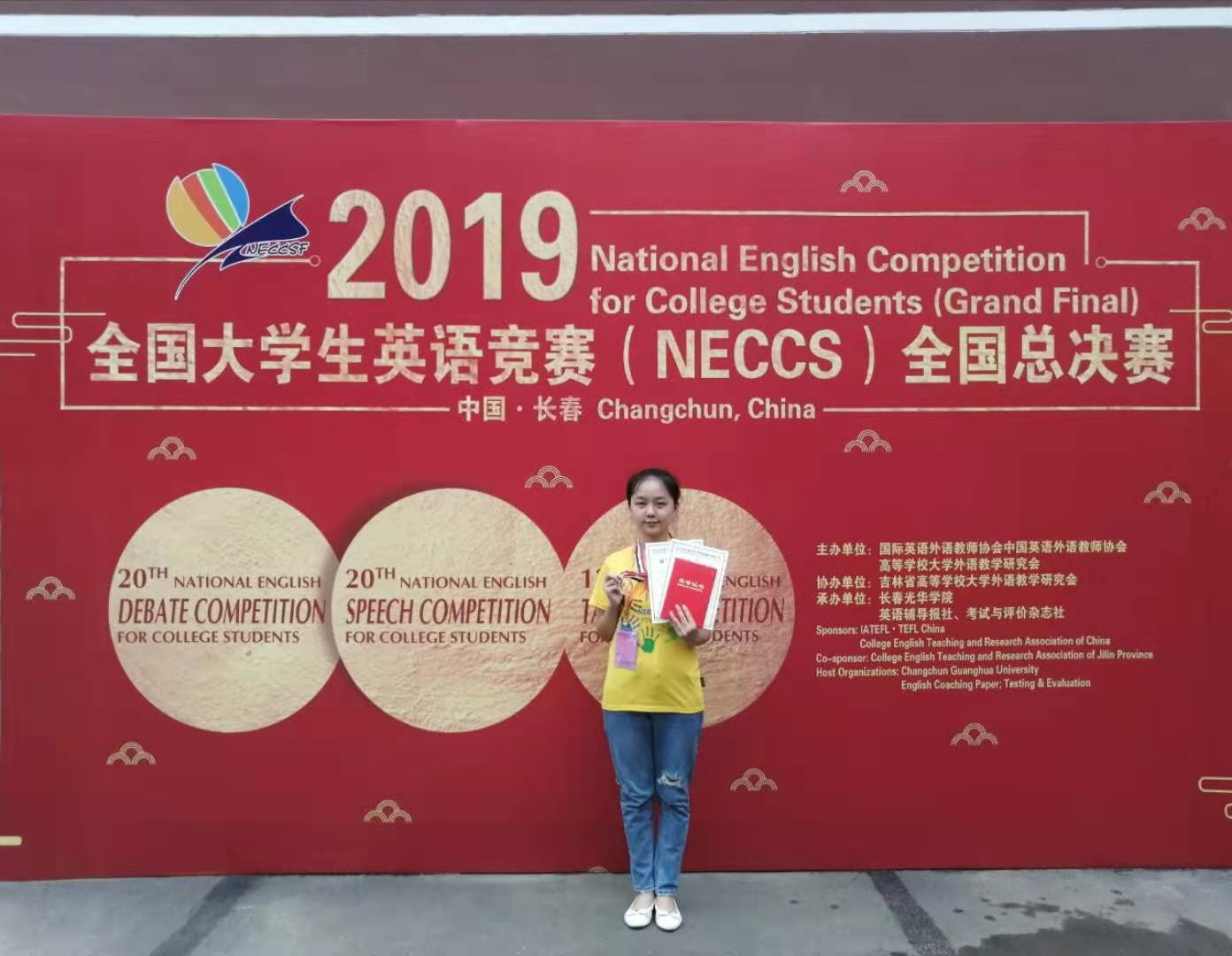 本网讯(审稿:李沛 供稿:张丹丹)8月7日,由国际英语外语教师协会和中国英语外语教师协会、高等学校大学外语教学研究会主办,吉林省高等学校大学外语教学研究会协办,长春光华学院、英语辅导报社、考试与评价杂志社承办的2019年全国大学生英语竞赛总决赛在长春光华学院落下帷幕。我院学子李歌畅以初赛校内第一名、决赛B组河南省第九名的成绩入围全国总决赛并斩获第二十届全国大学生英语演讲赛比赛三等奖和第十三届全国大学生英语风采大赛优秀奖两个奖项。