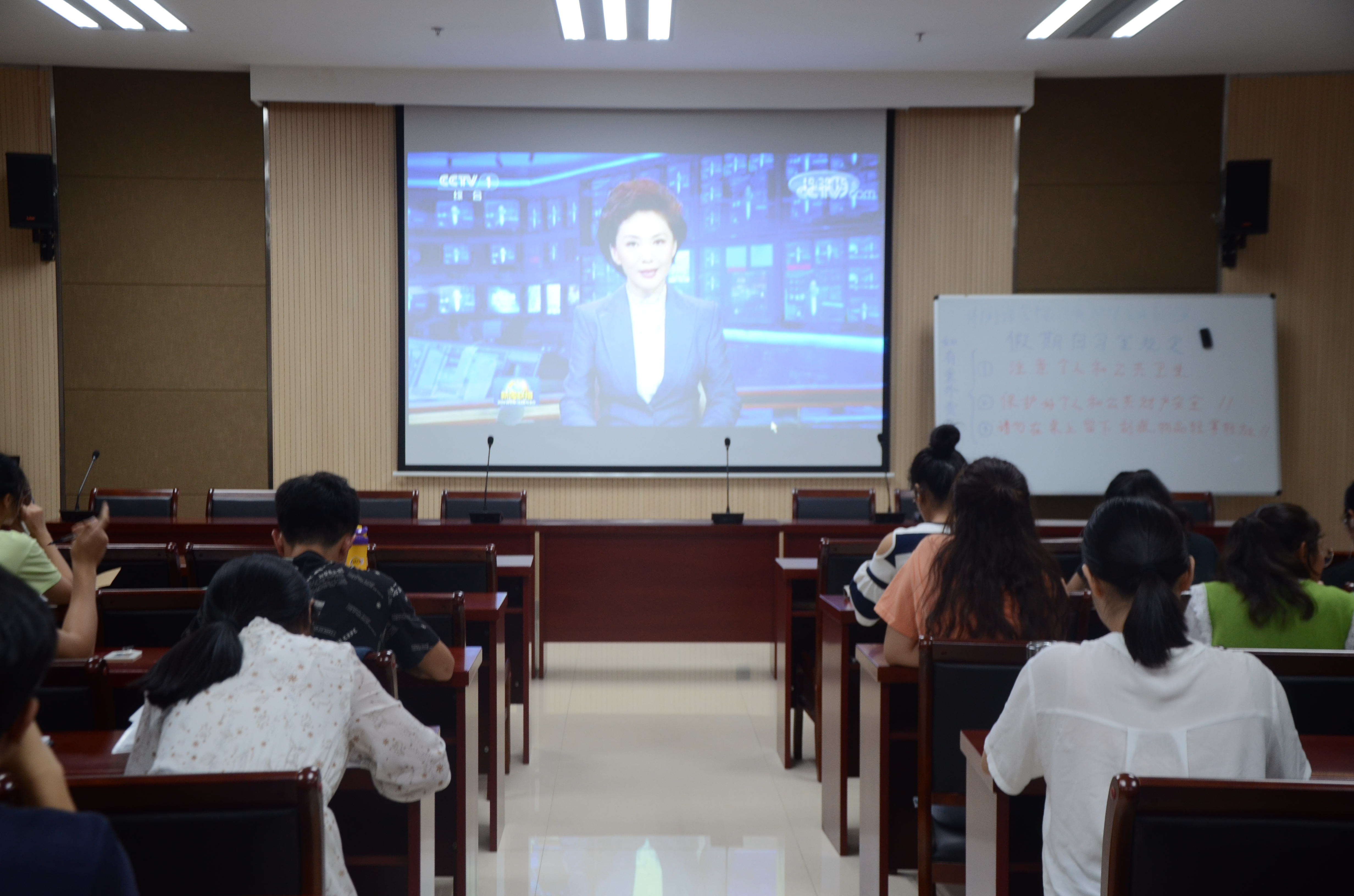 《新闻联播》开始,会场一片安静,学生们全神贯注观看,侧耳仔细聆听,通过《新闻联播》窗口,认真感受祖国心声,准确把握时代脉搏。