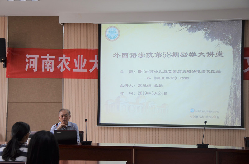 本网讯(审稿:王颖 供稿:饶芝玉) 为提高我院学子的文学素养,增强其对外国文学的了解,5月24日下午,我院在龙子湖校区繁塔楼A324教室举办第五十八期励学大讲堂。我院有幸邀请到河南大学高继海教授做了以“BBC对莎士比亚英国历史剧的电影化改编——以《查理二世》为例”为题的专题报告。学院教师代表张莉、聂宝玉携部分学生代表参与此次讲堂。本次讲座由聂宝玉主持。