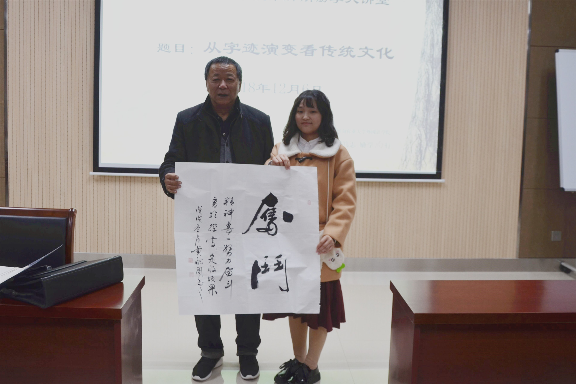 首先,黄献周通过解释自己姓名的含义,引起同学们对汉字的兴趣。接着他详细介绍了“书法”在各大辞典的释义并赋予了自己的理解,并指出书法是我国独具一格的艺术形式,是我国传统文化的重要表现形式之一,是中华民族精神和先人文化的历史结晶,从而使同学们对书法有了全新的认识。同时,他以朝代为序来阐述书法字体演变的历史进程,从汉字的诞生开始,沿着历史行程,详细介绍了汉字书体的产生及创新,由甲骨文到楷书,由繁到简,其间讲述了多位著名书法家的成长经历与艺术成就。随后他为大家展示了自己及其弟子的书法作品,行云流水、刚劲有力的字体让同学们惊叹不已,充分展现了书法的魅力。最后,黄献周表示,书法与中国文化有着重要的联系,作为大奶做爱
