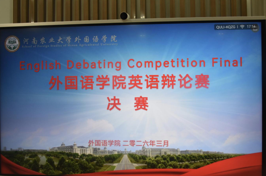 于繁塔楼A315举办英语辩论赛决赛。英语系系主任宋扬、党支部书记聂宝玉、系副主任关珊珊担任评委。