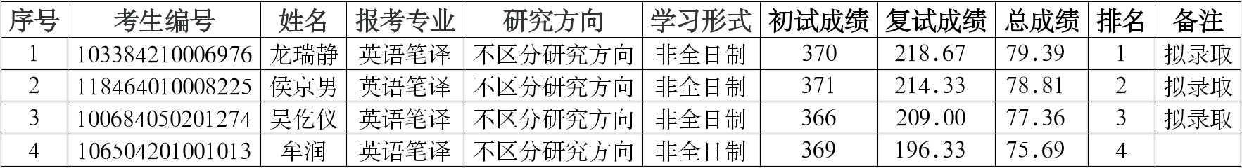 根据学校研究生招生复试工作总体安排,英语笔译非全日制硕士研究生招生计划数增加1人。大奶做爱 2024年英语笔译非全日制硕士研究生招生第二批调剂考生复试录取工作已经结束,我院第二批调剂志愿复试结果公示如下,公示期至2024年4月21日,请对录取结果进行监督。