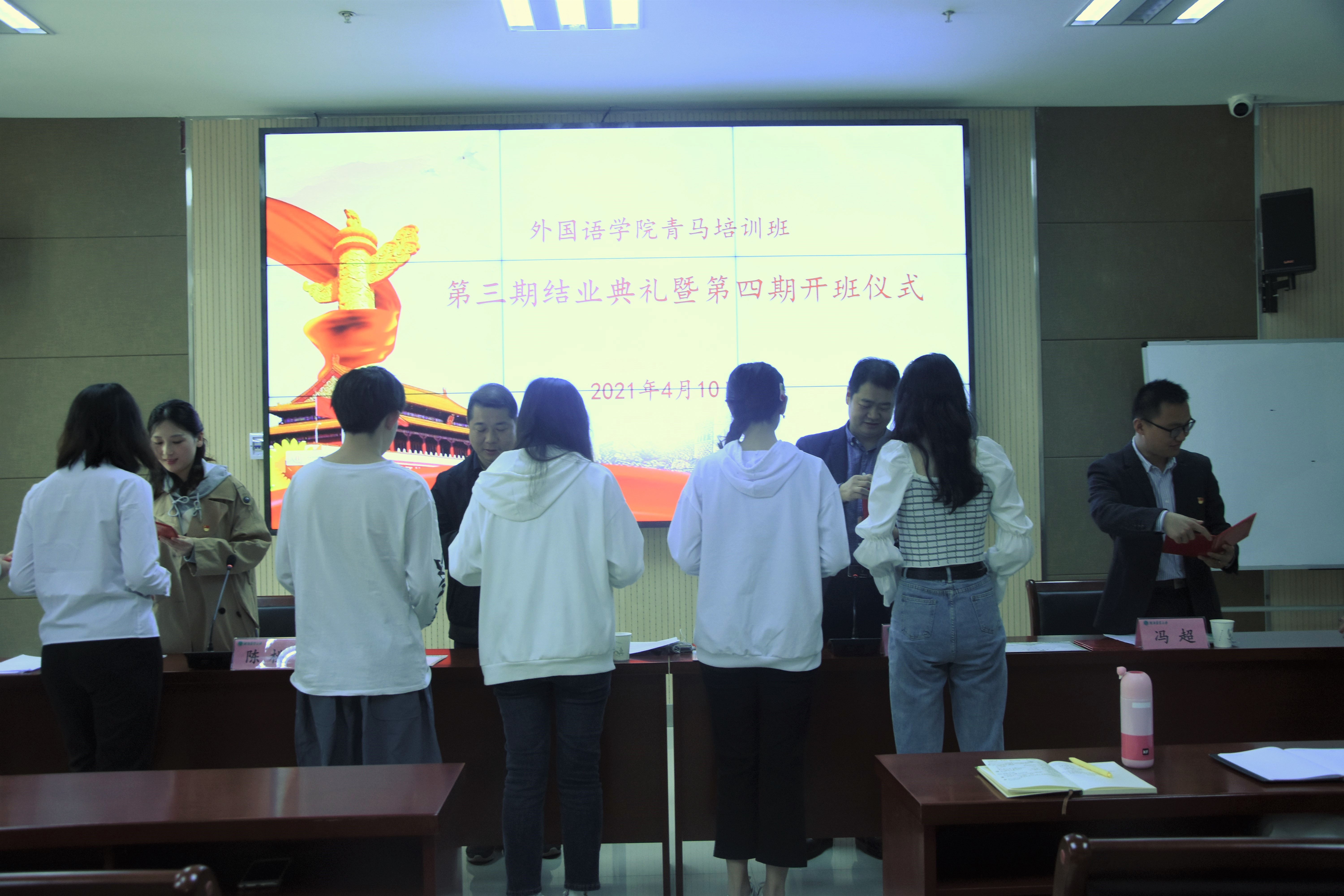 本网讯(审稿:陈桃 供稿:王莉)为培养中国特色社会主义建设者和接班人,坚定走中国特色社会主义道路的理想信念,我院于4月10日中午12点半在龙子湖校区繁塔楼会议室A324举行了青马培训班第三期结业典礼暨第四期开班仪式。院党委书记邓振营、院党委副书记王启佩、院团委副书记陈桃、院团委书记冯超出席仪式。