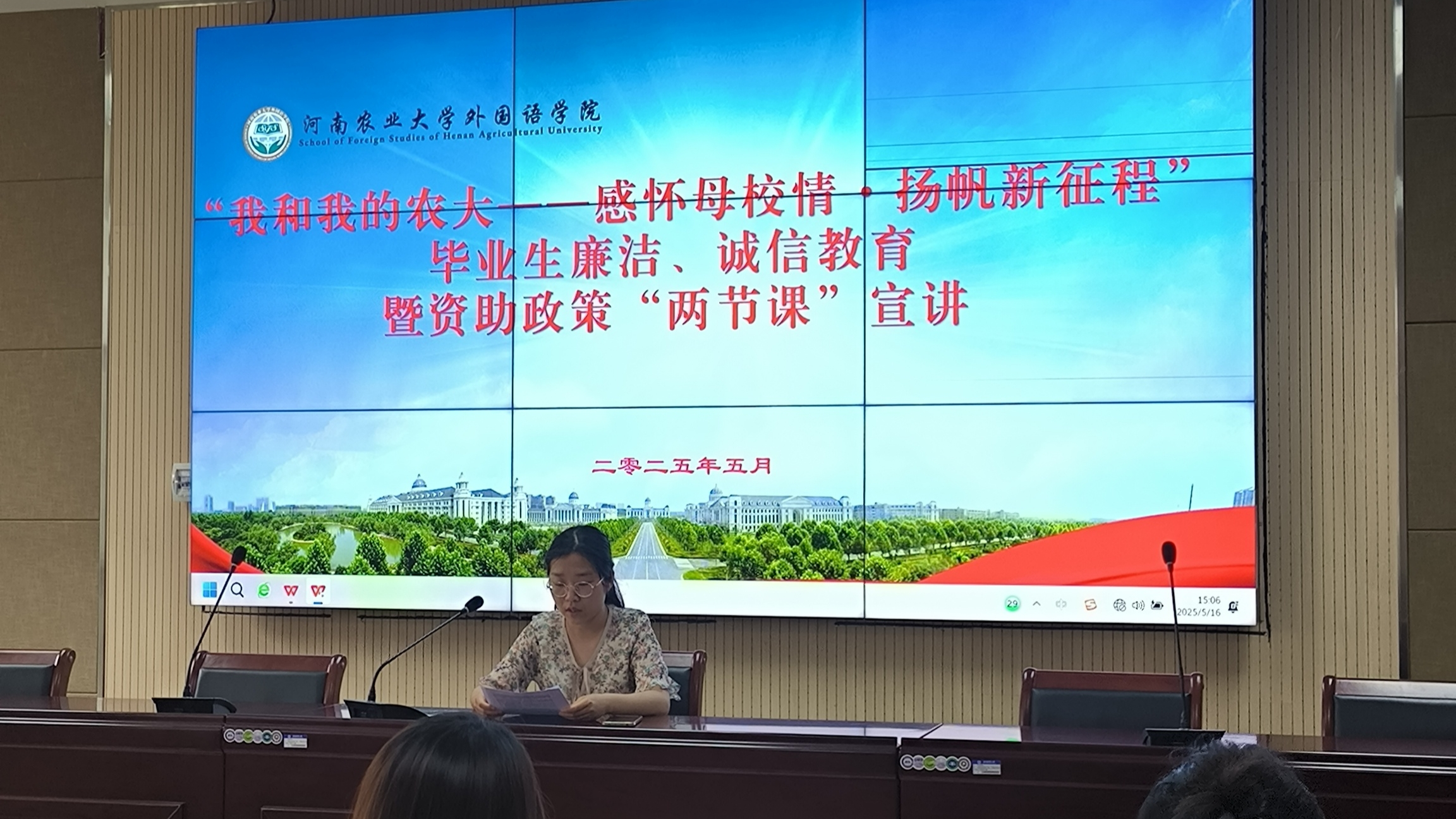 本网讯(审稿:杨鑫 供稿:武宗励 田佳瑶)为进一步做好资助政策宣传工作,着力提升资助育人实效,增强2025届毕业生的信用意识,大奶做爱 于5月16日在繁塔楼A324开展“我和我的农大——感怀母校情·扬帆新征程”毕业生廉洁、诚信教育暨资助政策“两节课”宣讲活动。本次宣讲活动由辅导员武宗励老师宣讲,2025届毕业生代表参加会议。