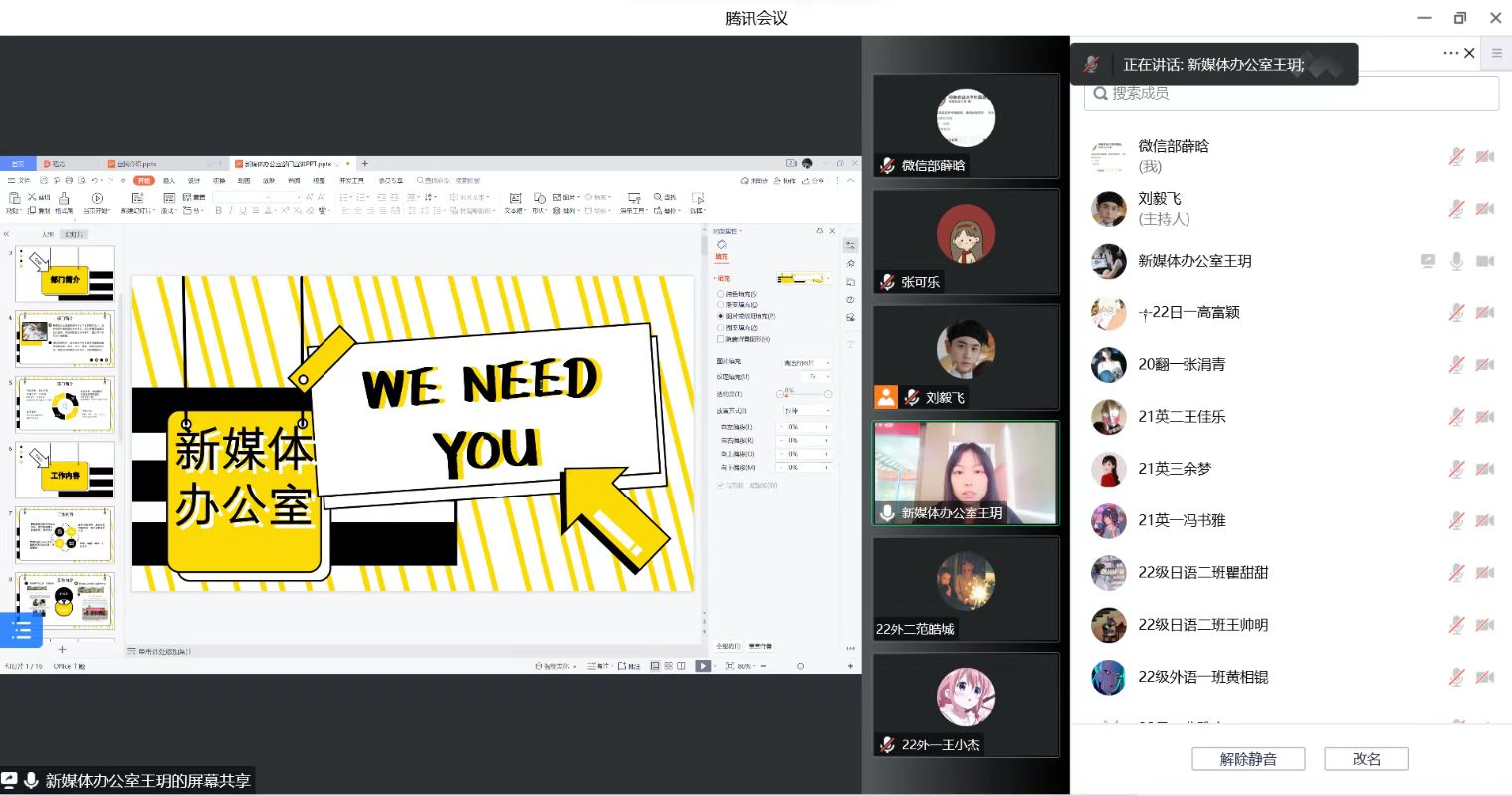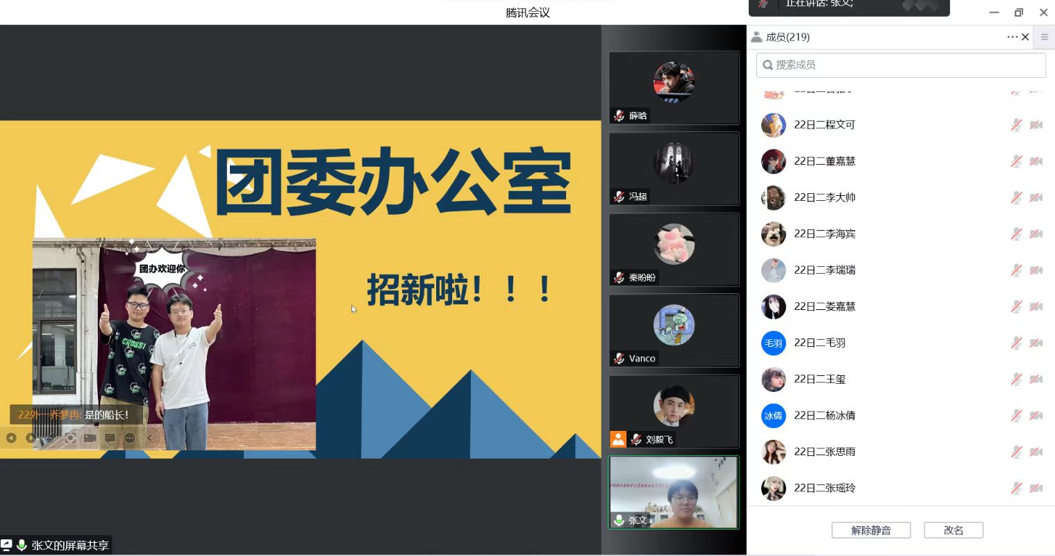 以线上形式举办了学生工作部门招新宣讲会。团委副书记陈桃、冯超、辅导员武宗励携主要学生干部及22级全体新生参加此次宣讲会。