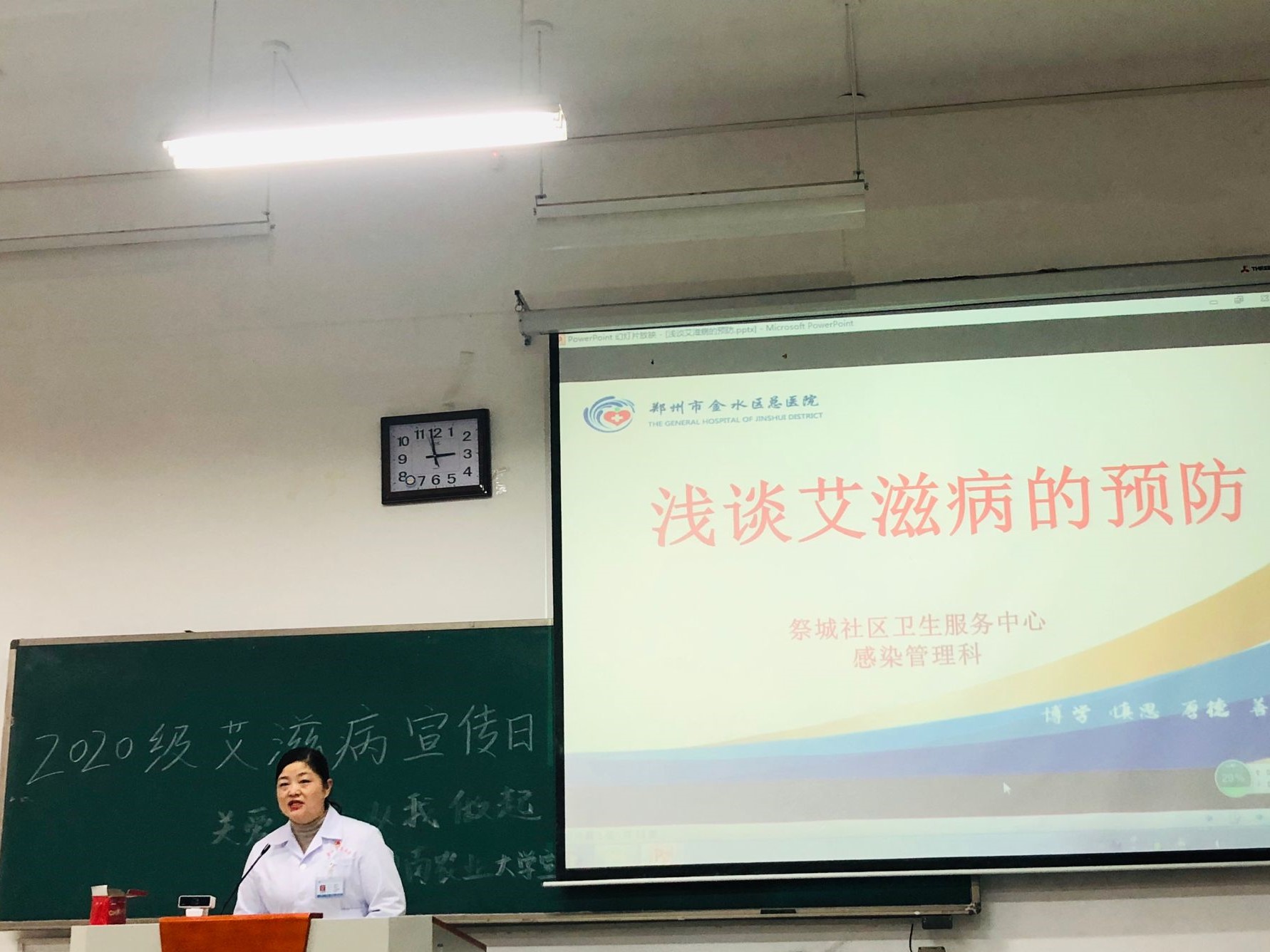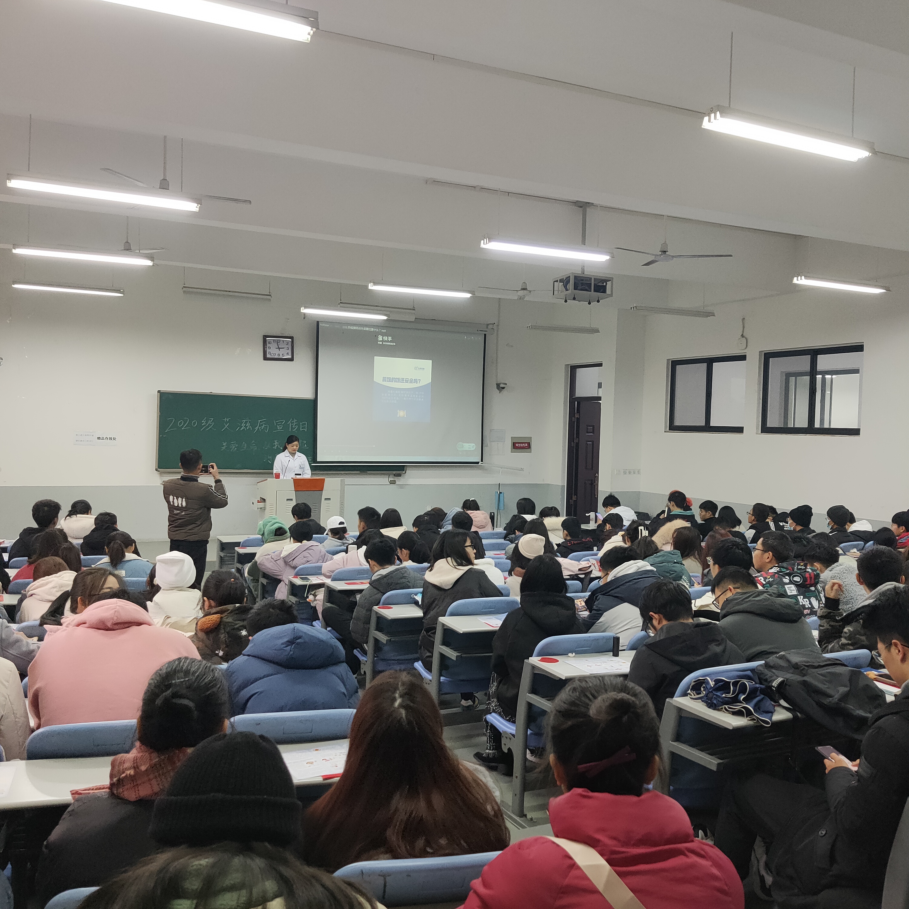 本网讯(审稿:李沛 供稿:王莉)12月1日是第33个“世界艾滋病日”,为增进我院学子对艾滋病的了解,提高其艾滋病防控意识,12月1日下午,我校校医院于龙子湖校区繁塔楼C102教室举办了“关爱生命,从我做起”艾滋病主题宣传讲座活动。我院学生认真聆听此次讲座。