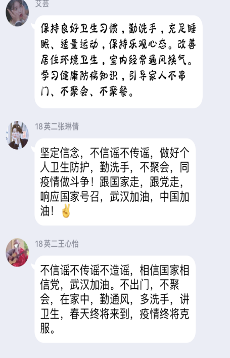 会议期间,我院辅导员、班主任以班级为单位,通过QQ群、微信群、网络视频等新媒体手段,认真有序进班开展班会。会议内容包括:一、教育引导学生科学有效防护,理性客观认识疫情。二、强调学校疫情防控有关要求:学生一律不得提前返校、准确报送个人信息、制定合理的学习计划,认真进行线上学习,做到防疫学习两不误。三、引导学生树立责任意识,激发其强烈的爱国主义热情,增强其民族自豪感和自信心,教育引导学生增强“四个意识”、坚定“四个自信”、做到“两个维护”。
