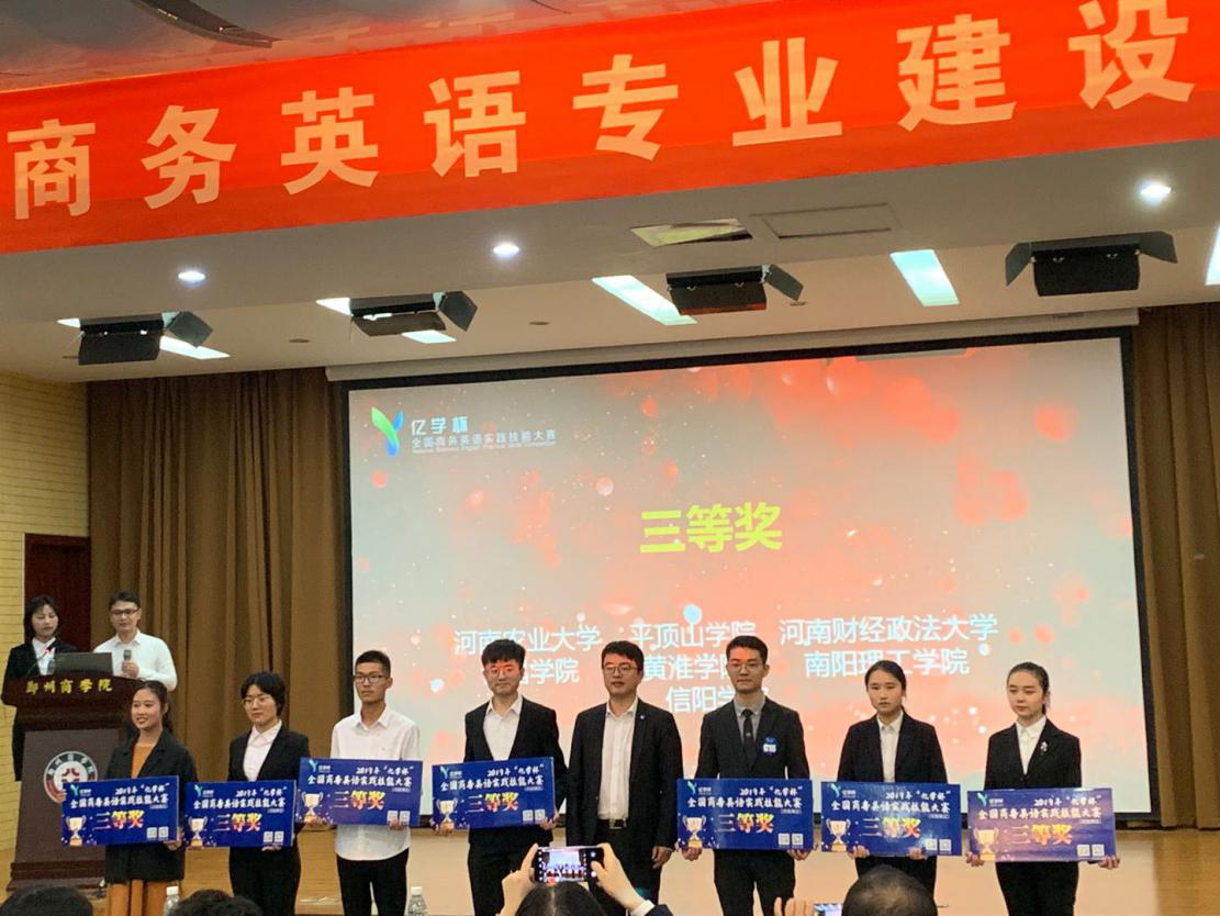 本网讯(审稿:李沛 供稿:张丹丹)第三届“亿学杯”河南省商务英语实践技能大赛于11月8日-11月9日在郑州商学院成功举办。我院学子代雨晴、李雨欣、李歌畅组成代表队,积极参与了此次大赛。在学院老师老师柴奇、关珊珊的指导下,他们运用扎实的商务英语知识,以精彩的口语表达博得众彩、脱颖而出,经过与来自24所高校的代表队为期两天的激烈角逐,最终喜获三等奖。